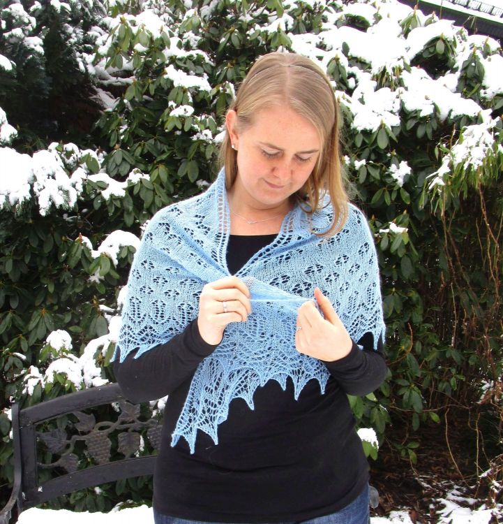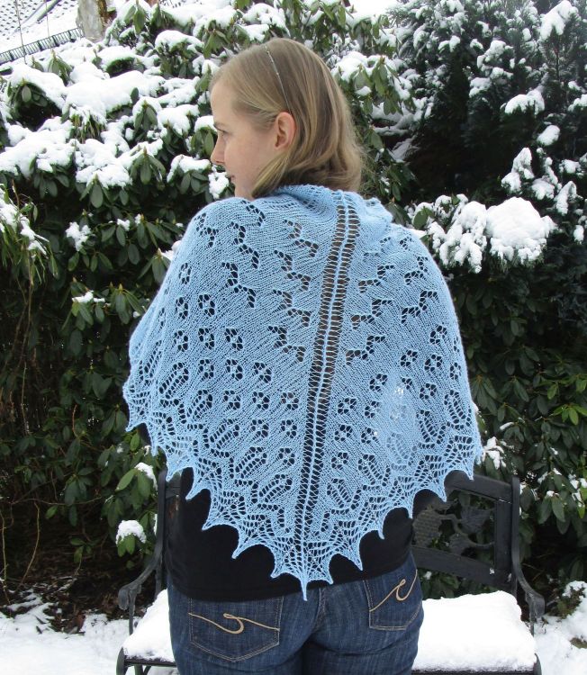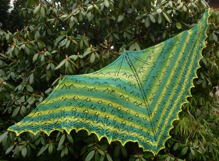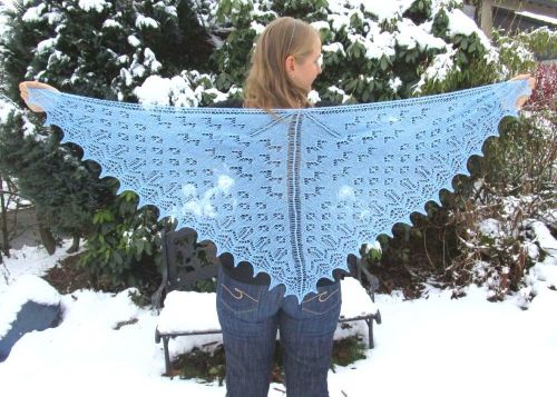 Am Ende des Winters mag man einfach nur noch an Frühling denken. Auf diesem Tuch sind die Frühlingsboten vereint. Einige Sonnenstrahlen in der oberen Mitte, darunter Vögel, die nach einem langen Winter nach Norden fliegen, und unten tauchen die ersten Blüten auf. Den unteren Abschluss bildet ein leicht zu strickender Spitzenrand. Die Mitte der Blüten kann man als Noppen oder mit Perlen stricken.