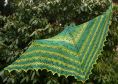 Grüngelbes Tuch: 100 Gramm Lacewolle handgesponnen, 600 m Lauflänge, Rundstricknadel 5 mm, 1 Maschenmarkierer für die Mittelmasche