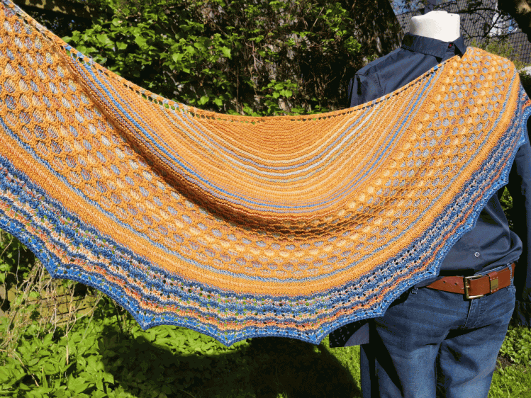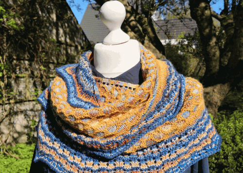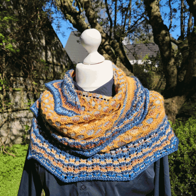 Das Tuch ist halbrund. Du benötigst vier verschiedene Farben, bei denen am besten zwei immer ein Paar bilden. Am Ende sollten natürlich alle vier Farben miteinander harmonieren. Das Tuch wurde sowohl mit bunter, als auch mit einfarbiger Wolle gestrickt. Beides ist wunderschön.