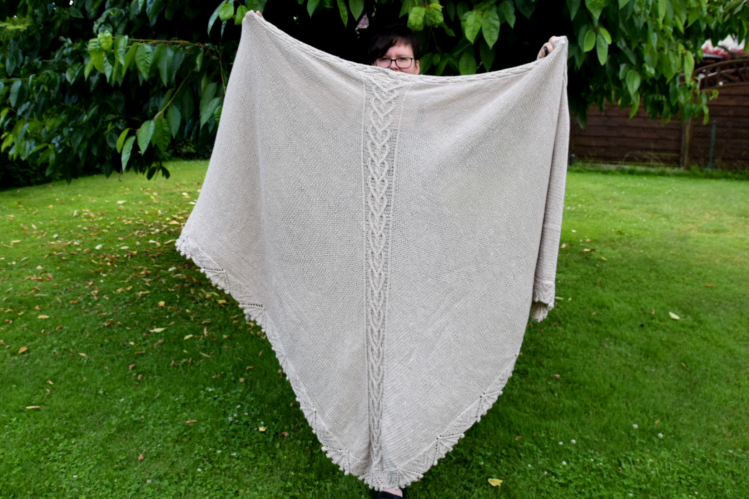 Ich habe 2 Größen integriert. Die kleine Größe ergibt ein Hals- und Schultertuch, die große Größe einen Überwurf, der an kalten Sommerabenden auch 2 Personen ein bisschen Wärme spendet.