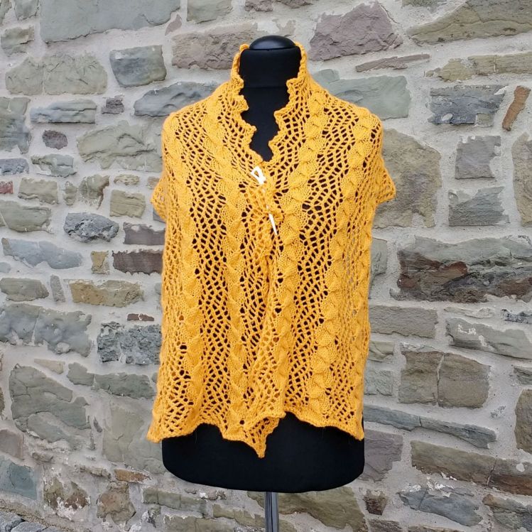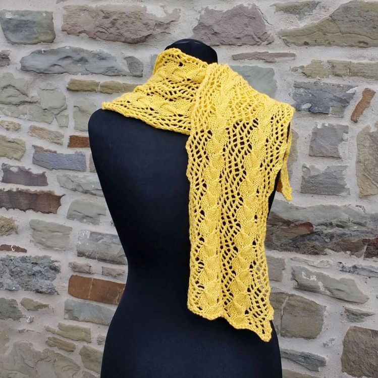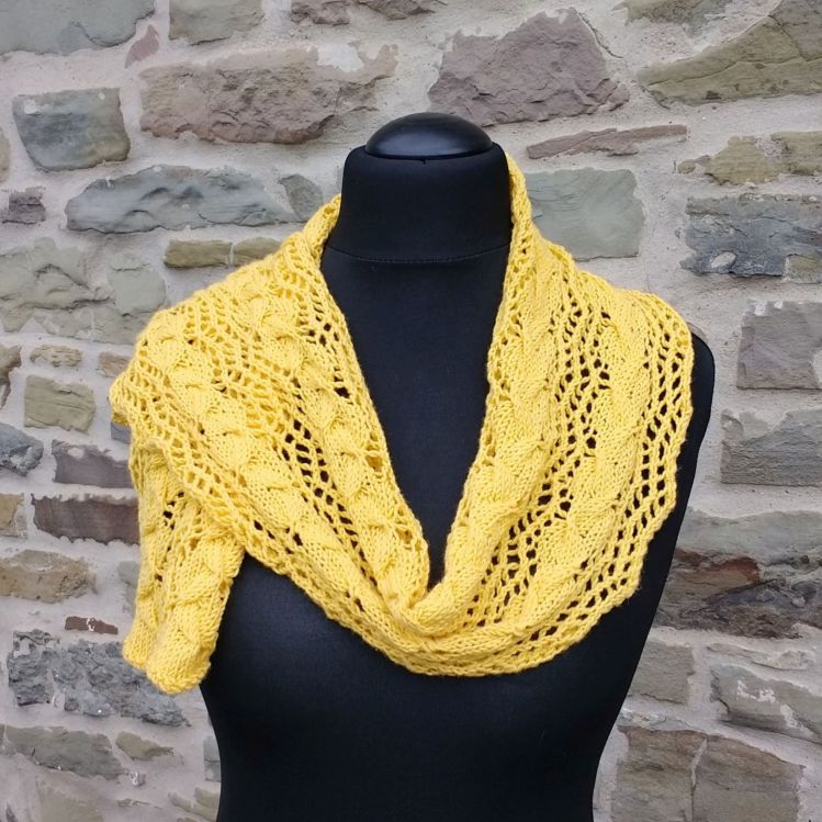 Schal 1 (gelb): 100 g Lana Grossa Cool wool Merino superfein (160 m/50 g), Rundstricknadel 5 mm, 1 Zopfnadel