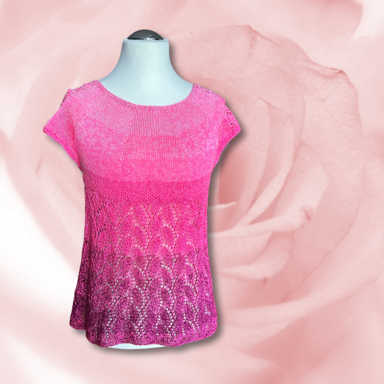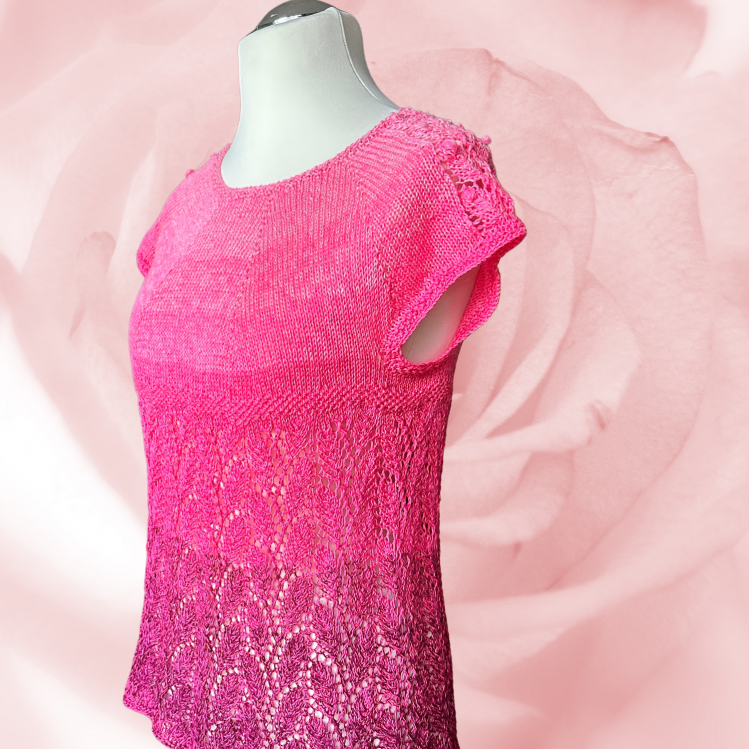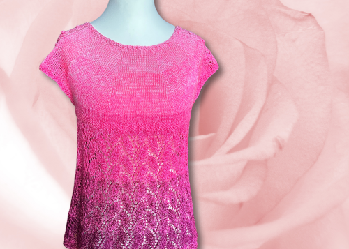Die Tunika wird von oben nach unten in einem Stück in Runden gestrickt. Das Muster auf den Schultern wird in leicht abgeänderter Form am Rumpf wieder aufgegriffen.