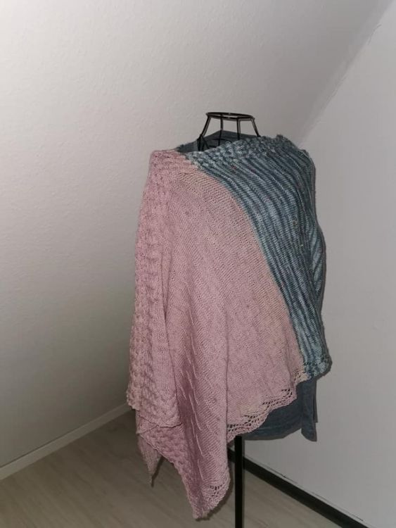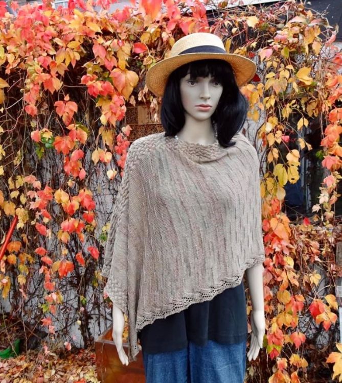 Der Zopfponcho hat seinen Namen von dem umrahmenden Zopf, der sowohl zu Beginn, zum Ende und durchgängig am Rand in einem schmalen Streifen mitgestrickt wird.